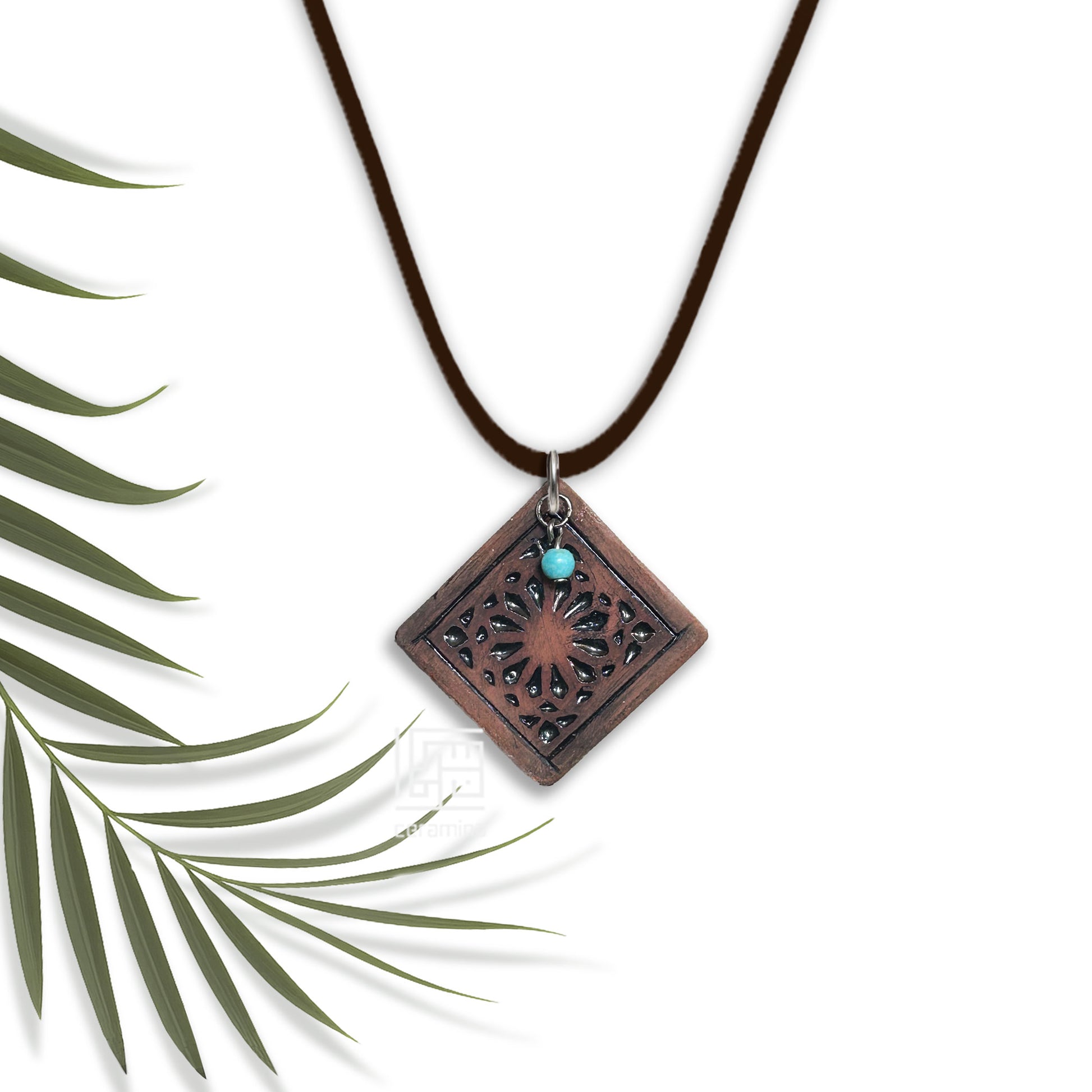 The pendant is completed with a brown suede cord and a secure clasp for comfortable wear. Minimal yet sophisticated, it complements smart-casual outfits and rests elegantly at chest length. The suede cord measures 48 cm, while the pendant itself is approximately 3 × 3 cm with a thickness of 4 mm.