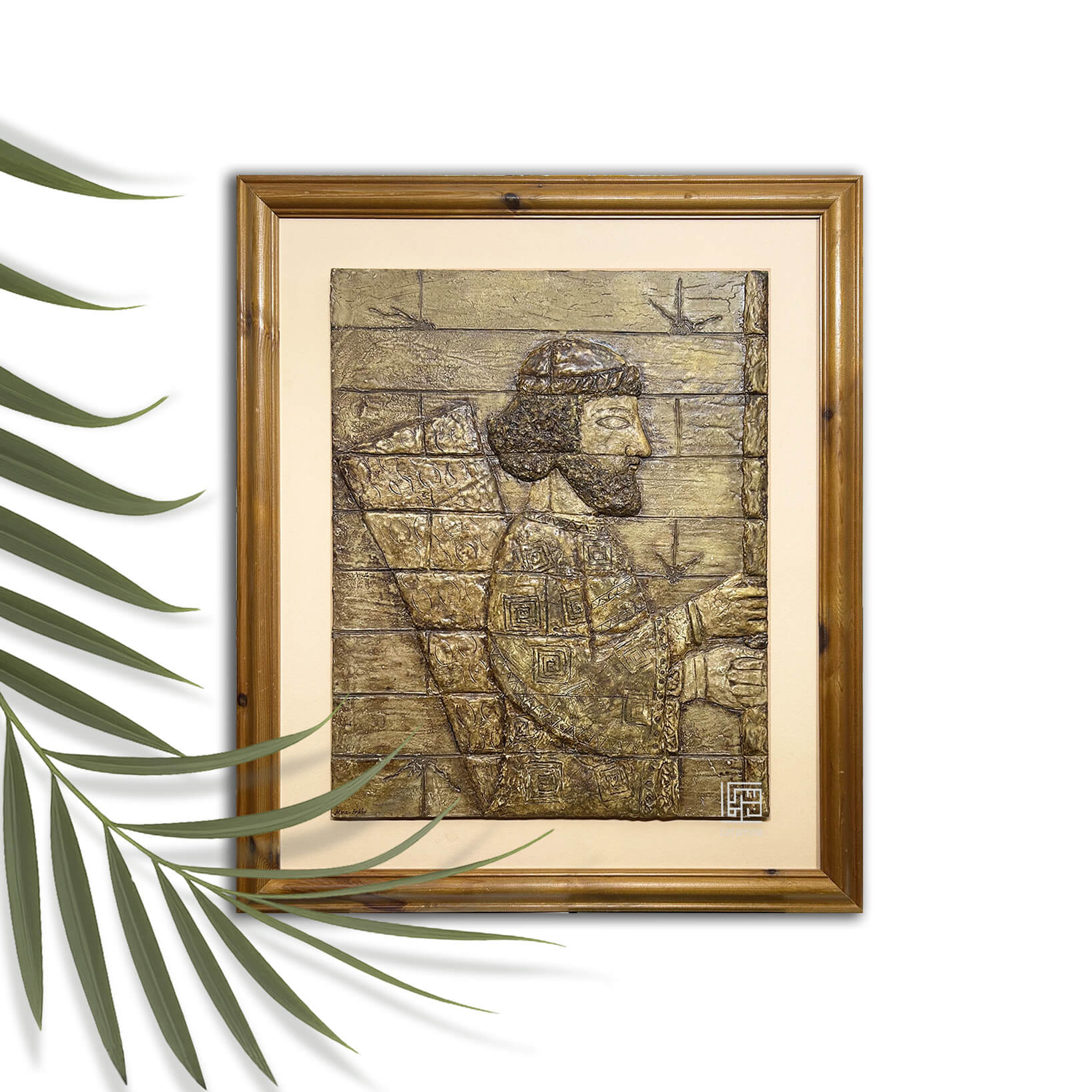 This mixed media artwork is inspired by the legendary character Gilgamesh, crafted entirely by hand using special clay to form a detailed human figure. The piece is created on plywood and presented in a wooden frame without glass, allowing the embossed texture to stand out naturally.