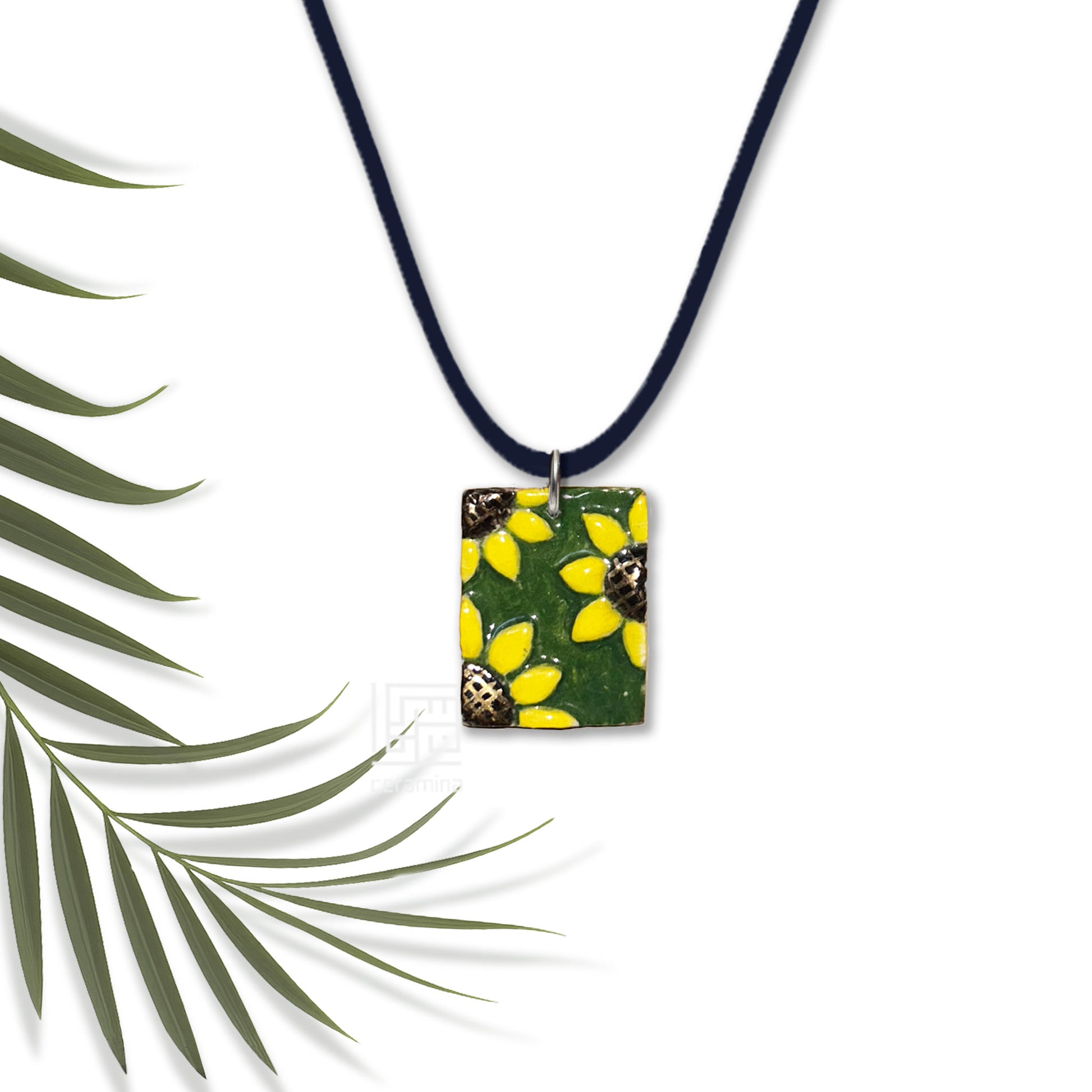 This handcrafted ceramic pendant is made from kaolin clay and formed into a rectangular shape, featuring a carved sunflower motif on the surface. Select areas are hand-painted and finished with a special gold glaze to enhance the design. An overglaze layer creates subtle, distinctive surface effects, making each piece truly one of a kind. Every pendant is kiln-fired twice to ensure durability and a smooth, refined finish.